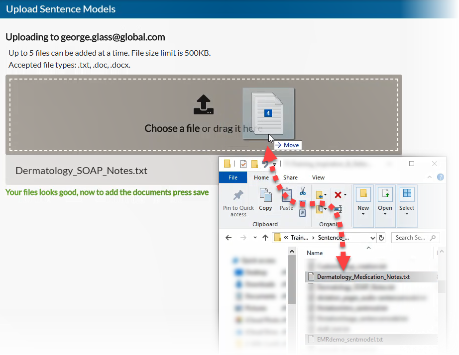 • There is a 500 KB PER DOCUMENT LIMIT for account and organization sentence model documents uploaded to the dictation engine.